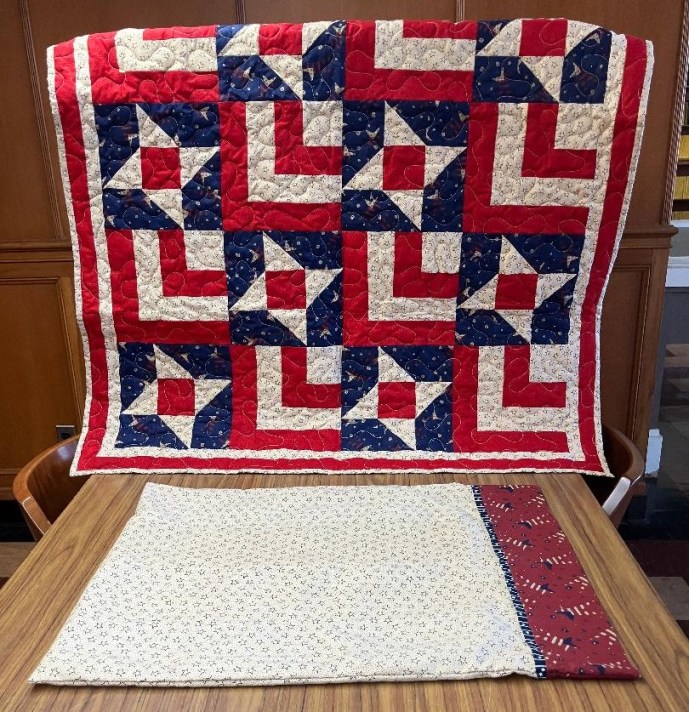 One of our largest fundraisers of the year is just getting started! Two friends and members, Debbie Prost and Donna Ballman have donated both of the items for this year’s drawing. Debbie has donated the beautiful hand made queen sized quilt pictured below, and Donna has donated a lap quilt with its own handmade carrying bag, also pictured, which would be perfect for a 4th of July picnic or for providing warmth during a fall football game. We are grateful to both for their generosity. Suggested donation for the Quilt Fundraiser is $1 per ticket, and $5 for six tickets. Download a ticket form here.